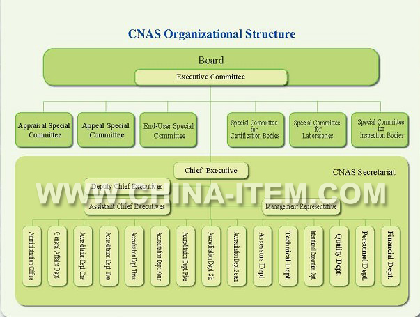 CNAS is composed of the Board, Executive Committee, Technical Committee for Certification Body, Technical Committee for Laboratory, Technical Committee for Inspection Body, Appraisal Committee, Appeal Handling Committee、End-User Committee and Secretariat. The CNAS Board is composed of the members from 65 organizations representing 5 interested parties e.g. government, conformity assessment bodies, clients of conformity assessment service, users of conformity assessment and technical experts.